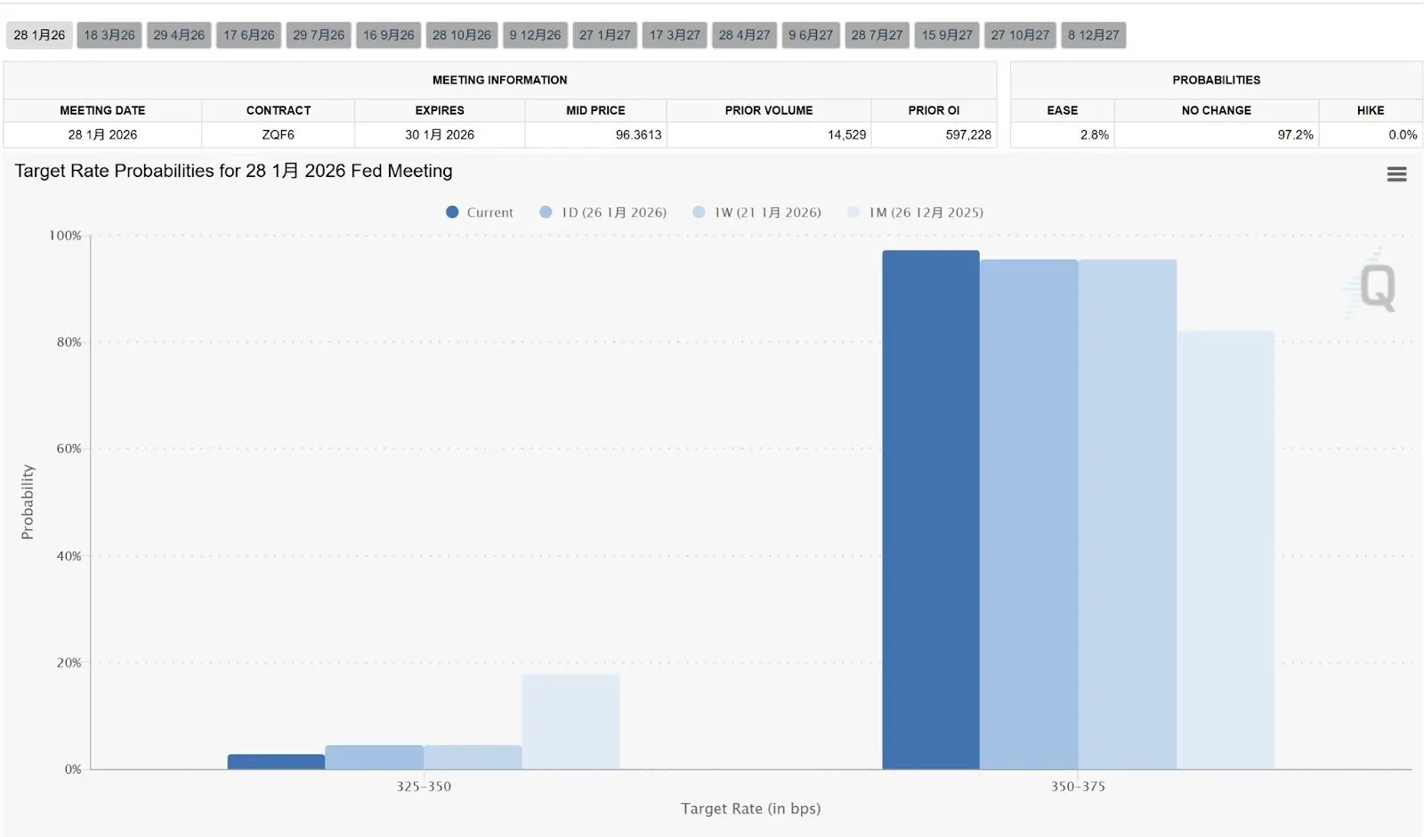 这是量化降息幅度最直观的工具。它根据联邦基金期货价格计算降息概率。