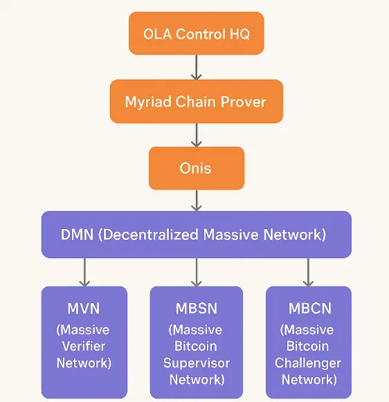 - Onis:以比特币作为settlement layer的 zkRollup,即 OLA 的零知识轻客户端去中心化验证及zkp管理模块。Onis 作为各条链的去信任轻节点,负责接收并存储来自 Myriad Chain Prover 的链状态证明,并在链上验证这些证明的有效性。Onis 本质上充当多链的验证者及chain proof的DA层:通过零知识证明技术,Onis 可以在比特币和其它区块链之间建立安全连接,实现资产和数据在多链间的无缝流动 。对于跨链桥而言,Onis 扮演目标链上链状态验证合约的角色,一旦验证通过某条链的新状态,就更新其内部状态根,从而维护多个链状态的同步。由于 Onis 是以比特币作为settlement layer的 zkRollup,其在确保安全性的同时保持了高效,实现跨链交互的安全与效率并重 。