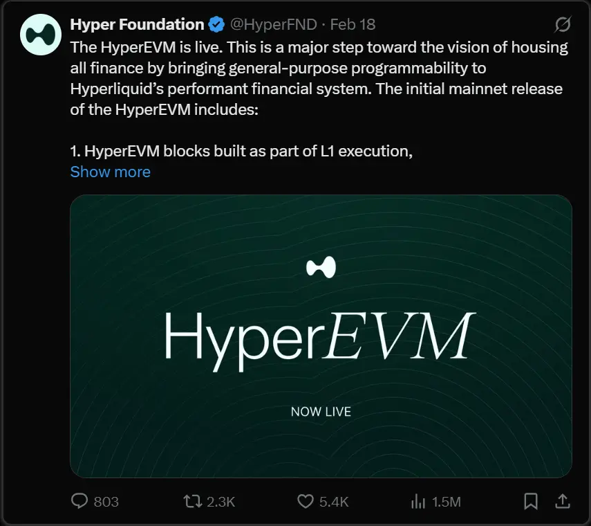 从永续合约到现货交易,Hyperliquid 的所有产品均建立在其定制区块链——Hyperliquid Layer1 之上。2025 年 2 月 18 日,HyperEVM 已正式上线主网。