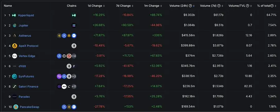 数据显示,在 24 小时内,链上永续合约的总交易量为 143.7 亿美元,而 @HyperliquidX 就占了惊人的 93 亿美元,占比高达 64.71%,展现出 Hyperliquid 在市场上的绝对统治力。
