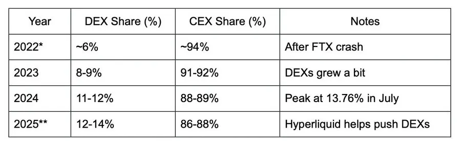尽管 FTX 等主要 CEX 崩溃,用户交易习惯并未立即转向 DeFi。许多交易者仍然使用 Binance 等中心化平台,并非因为他们忽视了托管风险,而是因为 CEX 始终具备: