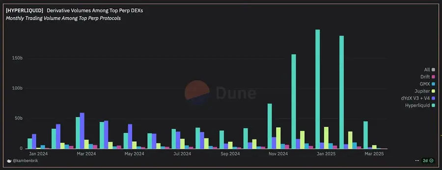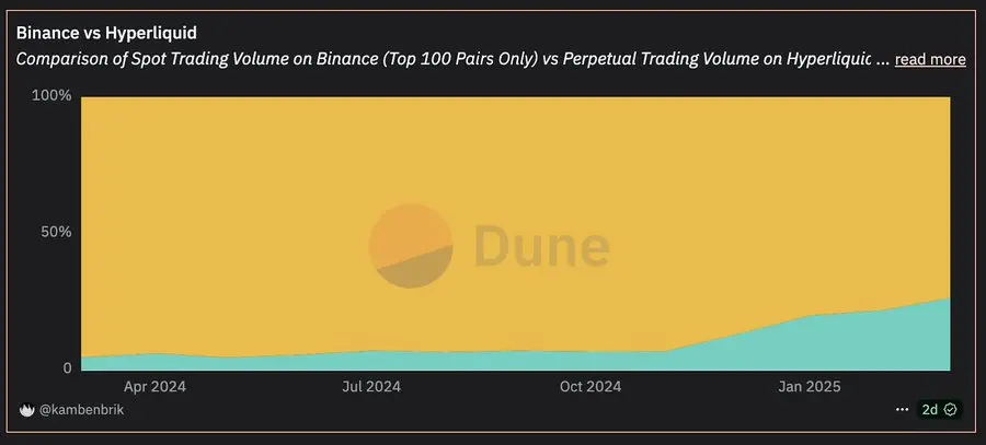 尽管 Hyperliquid 仍然小于像 Binance 这样的顶级 CEX,但它在某些月份缩小了差距,到了 2025 年 3 月,它的交易量占比超过了展示的总交易量的 26%(与 Binance 前 100 的现货交易对相比)。这一比较强调了一个链上高性能的永续合约交易所能够有效挑战甚至是主导的中心化现货市场。