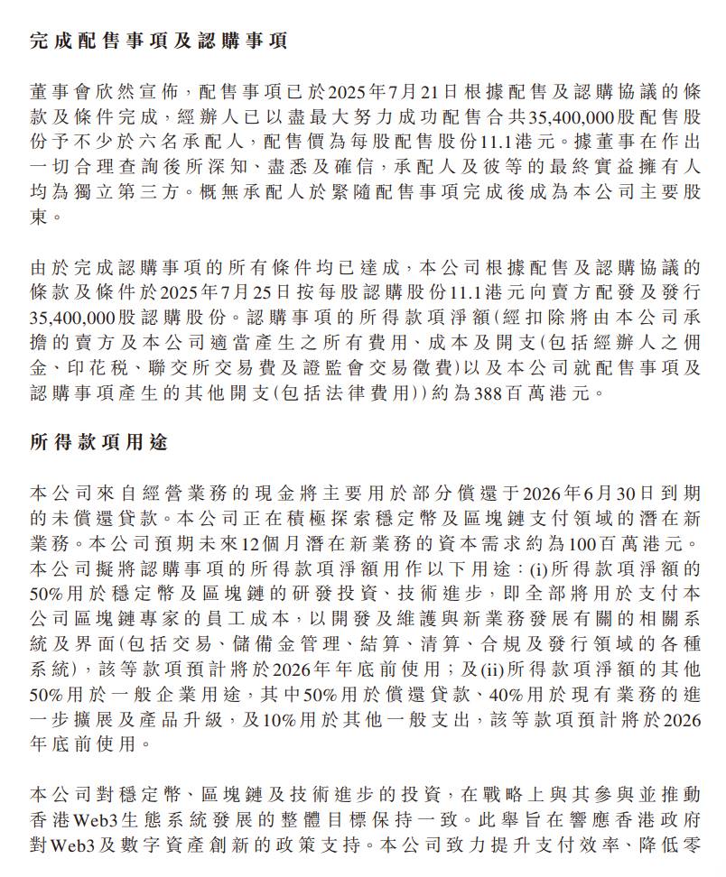 深潮 TechFlow 消息,7 月 25 日,据港股上市公司多点数智有限公司披露,该公司已完成配售及认购事项,筹集资金净额约 3.88 亿港元。公司宣布将 50% 资金用于稳定币及区块链研发投资,另外 50% 用于一般企业用途。