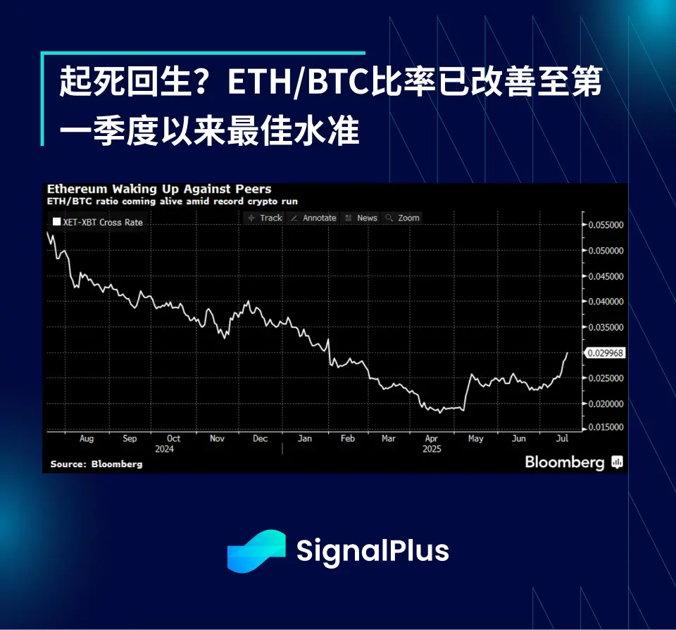 ETH/BTC 比率暂时从坟墓中复活,已改善至自第一季度以来的最佳水准。有人将此归功于稳定币/现实世界资产的关注点对权益证明网路有利,也有人将乙太坊新的国债策略视为上涨的催化剂。我们个人认为,这只是一次经典的风险偏好外溢,因为过去 7 个月主流传统金融的大部分资金都已充分布局在比特币上。