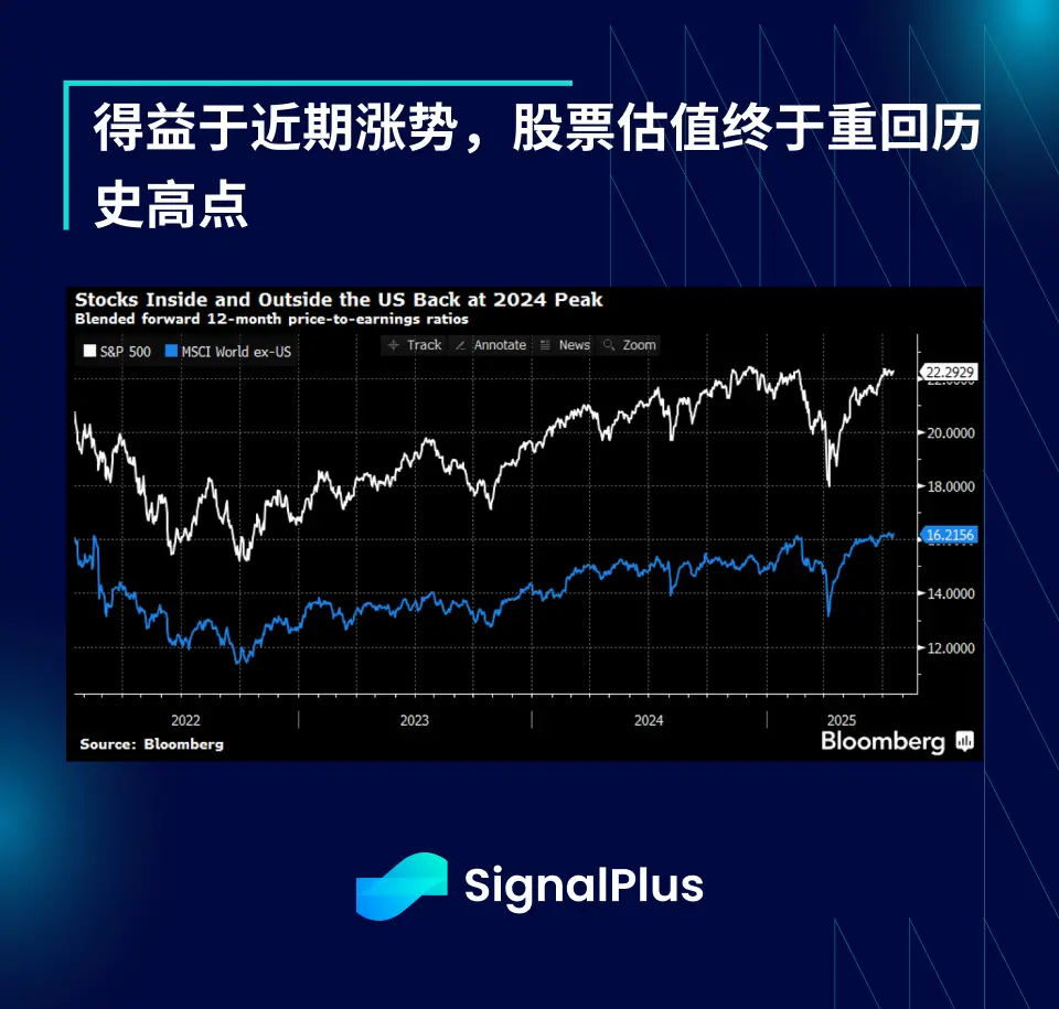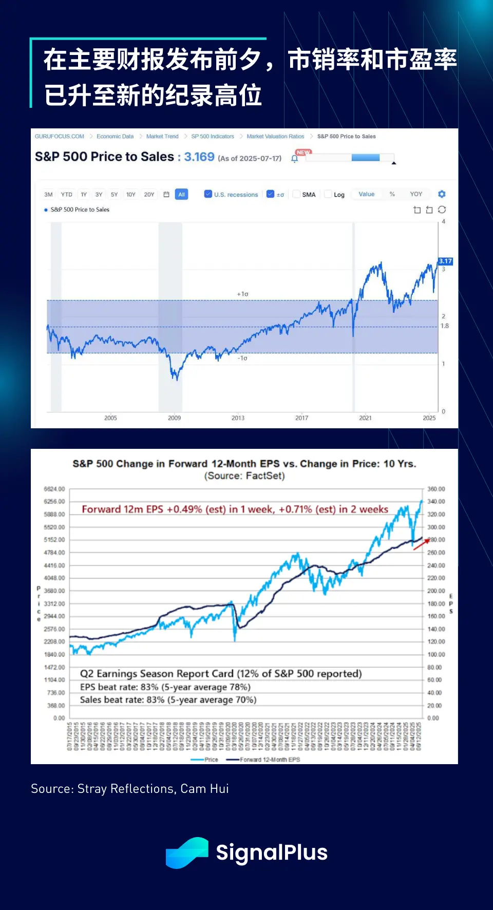 本周财报季将进入高潮,特斯拉和谷歌母公司 Alphabet 将于周三公布财报。据彭博社报导,标普 500 指数 498 家成分股中已有 58 家公布了财报,盈利超出预期 7.8% 。即使盈利在增长,美国和全球股票的市销率(P/S)和市盈率(P/E)也已升至或高于历史最高水准,投资者在此刻增加风险敞口正付出“全价”。
