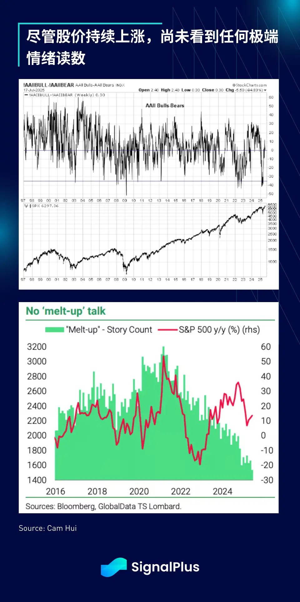 令人惊讶的是,尽管市场持续上涨,我们在传统的动量指标中尚未看到极端的情绪读数:美国个人投资者协会牛熊比率仍徘徊在区间中位附近,搜寻引擎对“暴涨”故事的查询量也保持在历史低位。