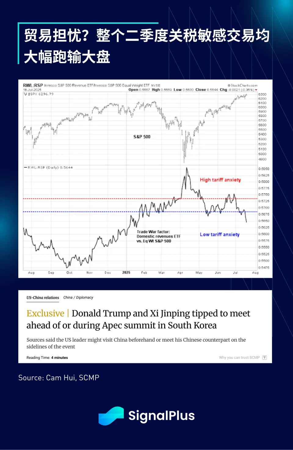 尽管面临新的威胁,市场几乎完全忽视了本轮关税升级,“关税敏感”主题板块继续跑输基准指数。无论是因为预期最终会出现“TACO”时刻(指贸易紧张缓和)、对主要交易伙伴(预期在韩国举行的习特会)的针对性攻击减弱,还是对私营部门能够应对冲击抱有信心,在收到进一步通知之前,市场对贸易冲突很可能继续保持充耳不闻的状态。