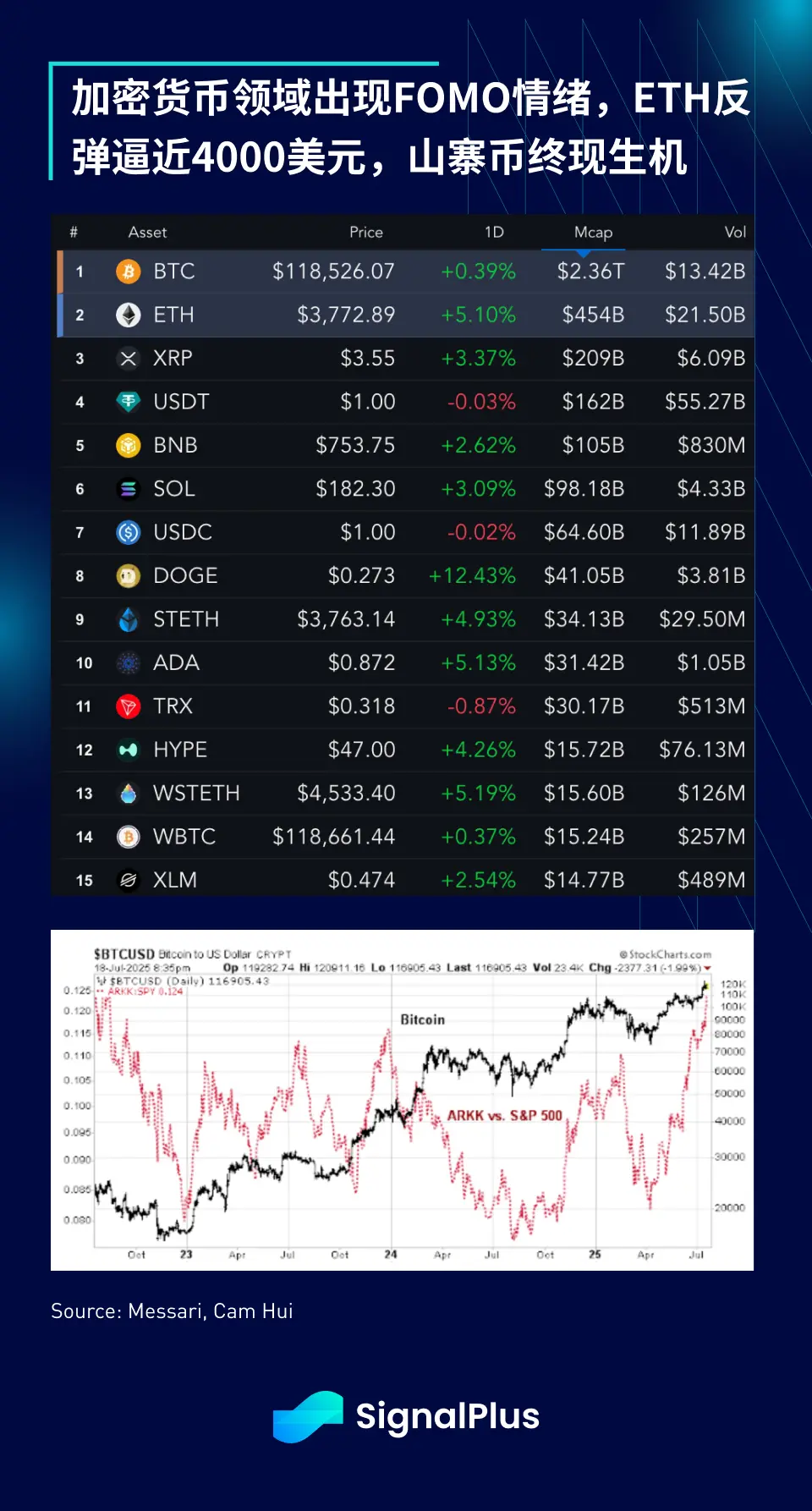 加密货币领域当然也没有错过我们自己的“错失恐惧症”时刻。乙太坊表现极佳,正逼近 4000 美元区域(5 个交易日上涨 22% ),一些主要的山寨币(altcoins)本周也录得两位数涨幅。比特币也创下了自己的历史新高,突破 11.8 万美元,尽管兴奋度略显克制。在收到进一步通知之前,感觉好日子又回来了。